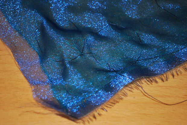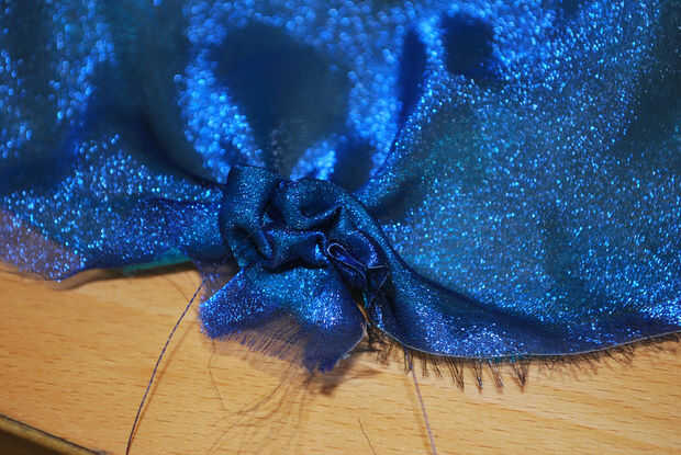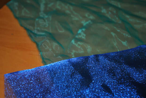 He cavado alrededor en mi escondite de tela y vino para arriba con algunos organza del poliester brillante color turquesa y azul real. También ha llamado chispa pura y normalmente odio trabajar con él. Batallas casi al instante cuando usted corte y los bordes de corte están desagradable espinosos. Acodar el azul sobre el turquesa hecho el color perfecto del pavo real, y la trémula pura calidad era exactamente lo que estaba buscando.