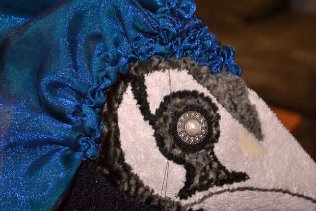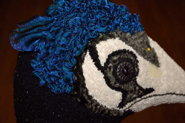 Seguí haciendo nudos y luego coser cada uno hacia abajo en ambos lados de la cabeza, trabajó mi camino en la parte superior de la cabeza. Para las porciones medianas que me cambié a una aguja curva, que hizo más fácil para mí coser entre cada nudo y cogerlos firmemente a la parte superior de la cabeza. He trabajado en las filas, variando el lado de mis círculos basted así que los nudos no conseguir demasiado incluso. Sobre a medio camino en hacer nudos, recorta una sección grande de la tela de la parte de atrás porque quería usar el resto de la chispa pura por debajo del pico. También tuvo otro vistazo a mi investigación de pavo real y había decidido que los ojos de perla botón eran demasiado ligeros, de modo que color los botones con un rotulador negro. A veces las soluciones más simples son las mejores!
