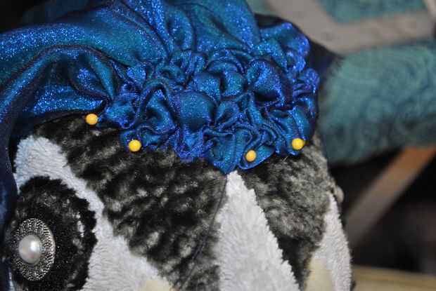Utilicé una técnica que se utiliza también para hacer la tela "capullos de rosa" o flores. Una vez puse el azul por el color turquesa, había enhebrado hasta la aguja de modista en poliamida azul marino y me cosen pequeños círculos en una esquina de la tela a través de dos capas, con puntadas grandes. Esto se llama un hilván o punto de reunión. Después de coser tiró el hilo apretado y listo! Tengo pequeños nudos superior del pavo real! Hace un poco más, luego cubrió a los bordes del nudo superior a la parte superior de la cabeza del pavo real. Luego usé el resto de mi hilo para coser los nudos superiores. Tomé pocas mordeduras de la tela y escondió las puntadas entre los nudos. Este método de costura sujeta los nudos manteniendo su textura hinchado.