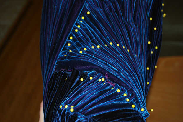 Comencé drapeado en la delantera del cuello con mi primera pieza de terciopelo azul y cubrió los pliegues hasta que se quedó sin tela. Entonces yo cortar otro trozo de terciopelo, esta vez una turquesa azul con matices de magenta. Doblado un borde sobre el borde cortado del azul más oscuro, cubrió en su lugar y me mantuvo en pliegues. Repetí el proceso con diferentes trozos de terciopelo, a veces plisado en direcciones opuestas. Si he cambiado las direcciones con mis pliegues, dejé una pequeña sala y algún terciopelo extra antes de comenzar la siguiente sección de plisar. Así, cuando me puse a coser los pliegues abajo I podría coser un borde, la clavija el terciopelo extra sobre la sección cosida y comience a coser la parte nueva en su lugar (ver cuadro #4).