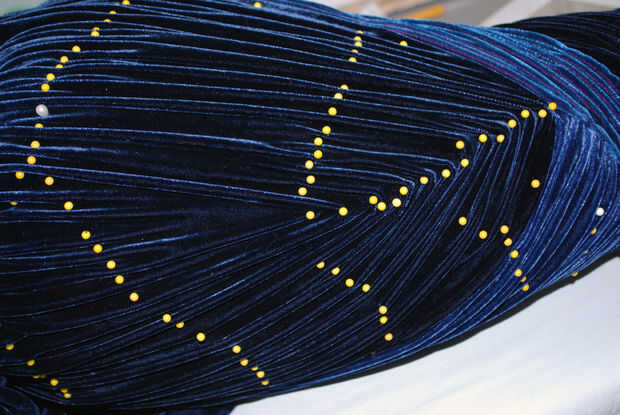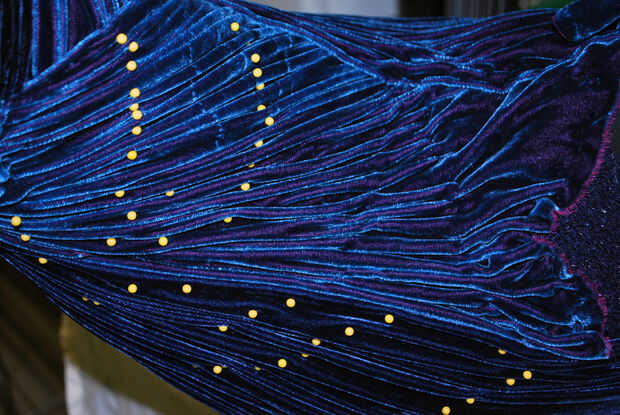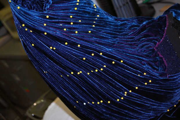 Para el área del pecho y el vientre usé un pedazo más grande de terciopelo azul oscuro y probado un método ligeramente diferente, fijando los pliegues hacia arriba en el centro y se irradia hacia fuera y hacia los lados y la parte inferior. Hizo una interesante invertida forma de "v" que se rompió para arriba un área más grande bien.