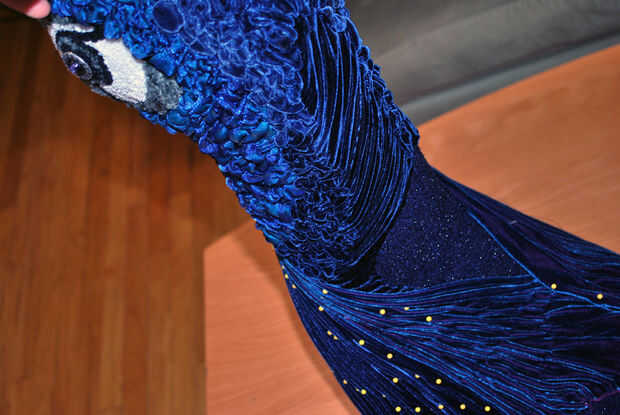 Amaba los mejores nudos en la cabeza y el cuello, pero quería una técnica diferente para decorar el resto del cuerpo. Plumas de pavo real cuerpo son más aerodinámico y suave que el nubbly protuberancias en la cabeza y el cuello. He pensado que subiendo algunas otras maneras de hacer plumas individuales. Encuentro fans poco o cortar los bordes de las formas de plumas con tijeras dentadas y les superposición de funcionaría, pero las muestras que he probado a no mira a la derecha entonces pensé de cubrir el cuerpo con pliegues de terciopelo. Perfecto! Yo tenía un montón de piezas diferentes de terciopelo azul y pude hacer un patrón que fluye sobre el cuerpo.