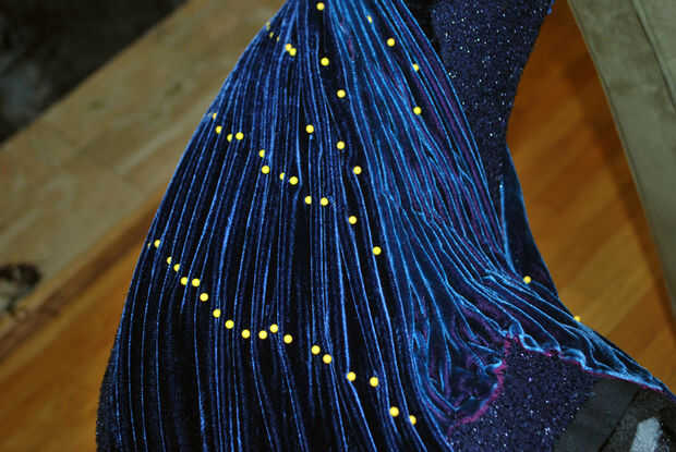 Algunas de mis piezas de terciopelo había cortado en triángulos y sesgo drapeado sobre el cuerpo en diminutos pliegues, fijando cada cresta para mantenerlas separadas. Drapeado diagonal significa cubrir a lo largo de la diagonal en vez de hacia arriba y abajo o directamente a través de la tela. Bies plisado drapeado estira un poco y se esculpe muy bien en curvas. Piensa en vestidos drapeados diagonales desde la década de 1930 en toda su gloria de cuerpo-abrazando!
