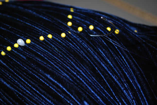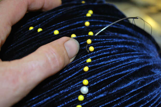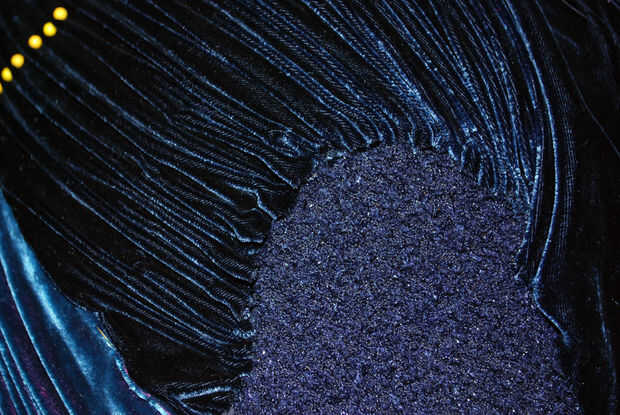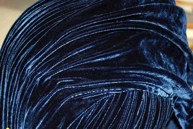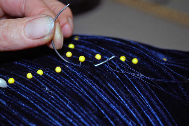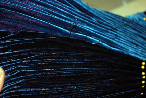 Coser los pliegues fijados fue una historia diferente. Me cambié a la aguja curva y un solo hilo, anudar mi extremos de entre 2 piezas superpuestas de terciopelo. Dirige la aguja por lo que se acercaba el punto entre cada pliegue, justo alrededor del perno. Entonces hice una pequeña puntada trasera, que significa que hice mi puntada un poco detrás de donde salió la aguja. Entonces repetí el proceso una y otra y otra vez. Hay un montón de pliegues de este pájaro! Este método es seguro y fuerte, y puesto que la costura estaba escondida en los pliegues de los pliegues era prácticamente invisible.