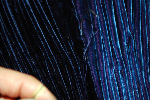 Cuando llegué a las áreas donde una pieza de terciopelo se dobla sobre otra, hice una puntada suave funcionamiento detrás para sujetar la tapa en su lugar y mantener los bordes crudos de salir. Eso significa que teniendo puntadas un poco más grandes por debajo del doblez, cose un poco muy poco en la parte superior del pliegue y tirando del hilo muy suavemente para que el doblez no ondulación o haz roto hacia abajo. A veces también se llama una puntada de pinchazo. No es muy durable pero es muy bonito.