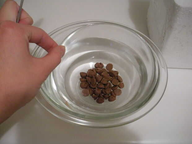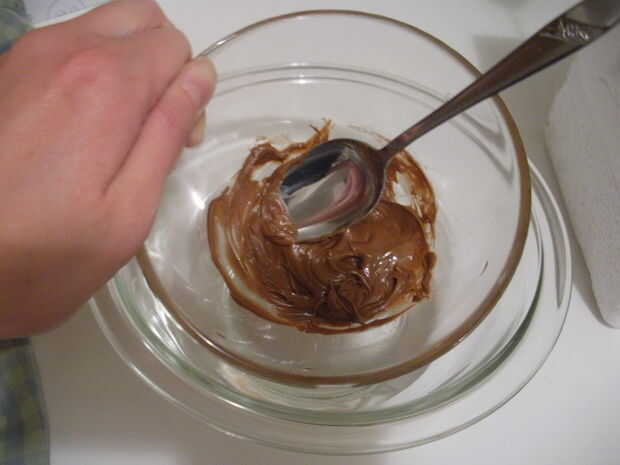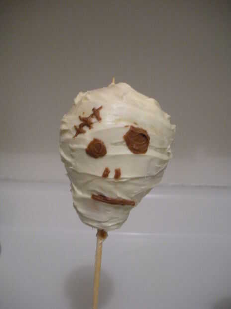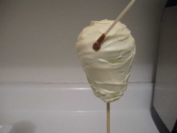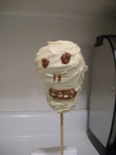 Dibujar su cara de zombie en la pera. Utilicé un palillo de dientes para ello. También encontré girando el toothpick en el chocolate derretido ayudó mucho para evitar que gotee demasiado. También ayuda a ir lento - deje líneas endurezca antes que se intersecan con nuevas líneas.