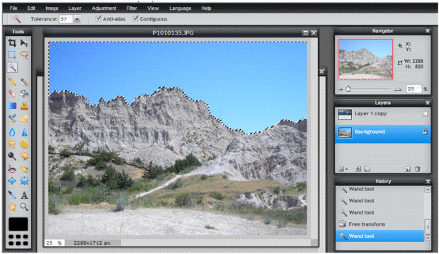6. en primer lugar voy a apagar las nubes en el cuadro capa haciendo clic en la casilla de verificación. Luego utiliza la tolerancia de la herramienta (herramienta de tercera en la caja de herramientas - parece una varita) para resaltar el cielo en el fondo. Quizás tenga que jugar con el nivel de tolerancia para hacerlo bien!