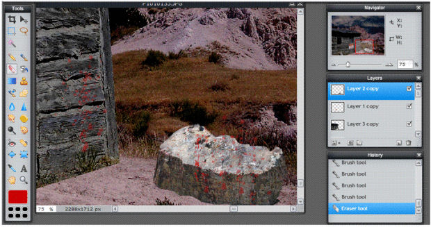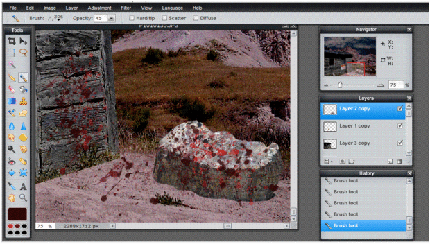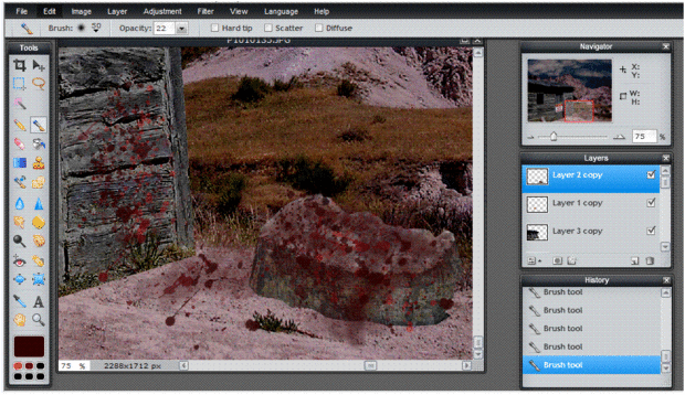 8. Agregue su salpicadura donde usted desee. Cambiar del pincel a pinceles de salpicaduras diferentes. También desea variar las tonalidades de rojo haciendo clic en el cuadro de color en la parte inferior de la caja de herramientas