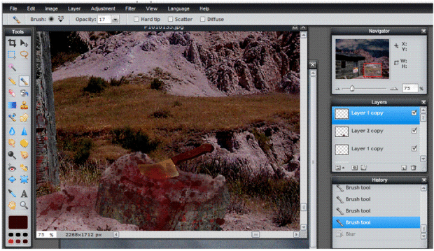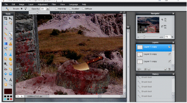 6. Utilice el pincel con un color rojo oscuro, baja la opacidad y el tamaño. Luego añadir el rojo a la manija del cuchillo porque queremos que sea como su uso. Luego agregar algunos rojo a la hoja del cuchillo para hacer parecer recién utilizado.