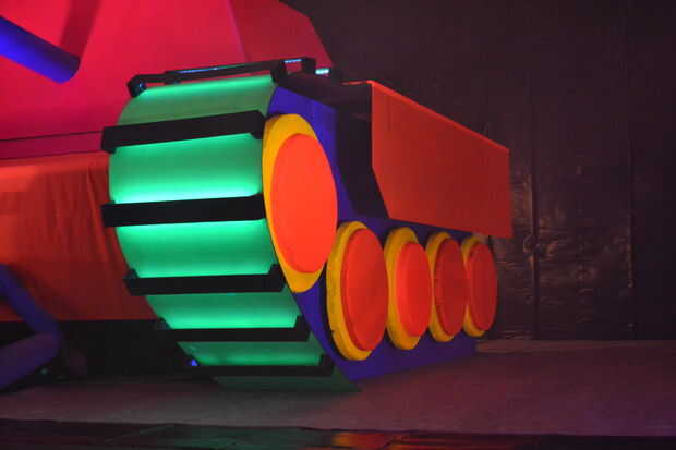 y CO2 de blastos. No fue ninguna hazaña pequeña diseñar un sistema que efectivamente hacer todo eso por un arma del tanque, y vino con una etiqueta de precio muy grande. Las restricciones presupuestarias resultaron en un tanque con un efecto de láser UV. Enteramente en colores fluorescentes, es sobre todo súper vivo