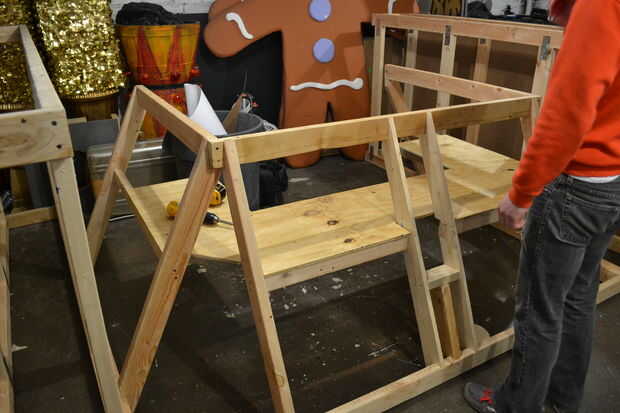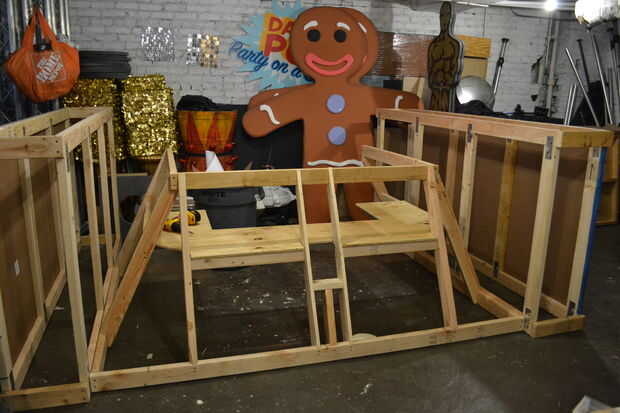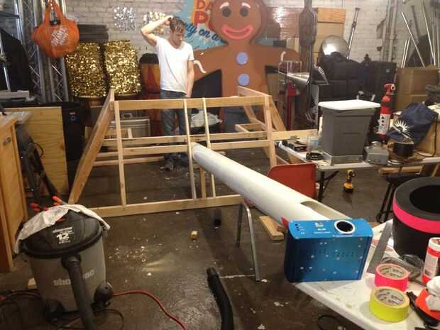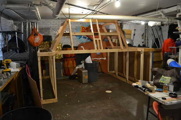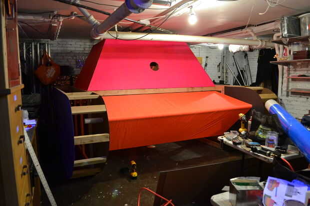 La sección de centro se compone de tres pisos que bolt juntos, con la tabla de equipo de DJ atornillar en su lugar para estabilizar aún más todo. La parte frontal inferior del tanque no tiene casi ninguna estructura física ya que es unas pocas yardas de material fluorescente impermeable con velcro conectarse dos horizontal 2 x 4 en la estructura del centro y envuelto alrededor de un tubo de PVC para crear una forma sólida.