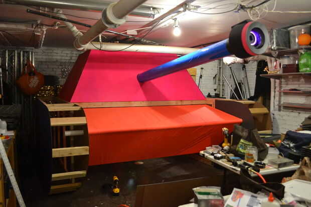 La pistola era un tubo de PVC de diámetro grande, envuelto con película gráfica del vinilo azul fluorescente.