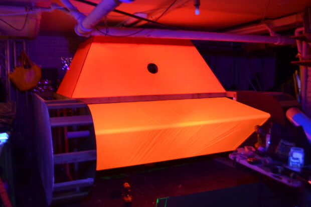 La carcasa del láser es rectangular y no puede caber en el extremo del tubo, así que para resolver ese desafío y para crear un extremo de la pistola más visualmente interesante, fue creada una muesca en el tubo de PVC lo suficientemente amplio como para acomodar el láser verticalmente con él ha compensado abertura láser ahora centrado en la abertura de la tubería. Luego, el extremo cortado de un bote de basura de plástico negro con un orificio en la parte inferior se añade al final de la pistola junto con un anillo de cerca UV LED montado alrededor de la abertura del laser.