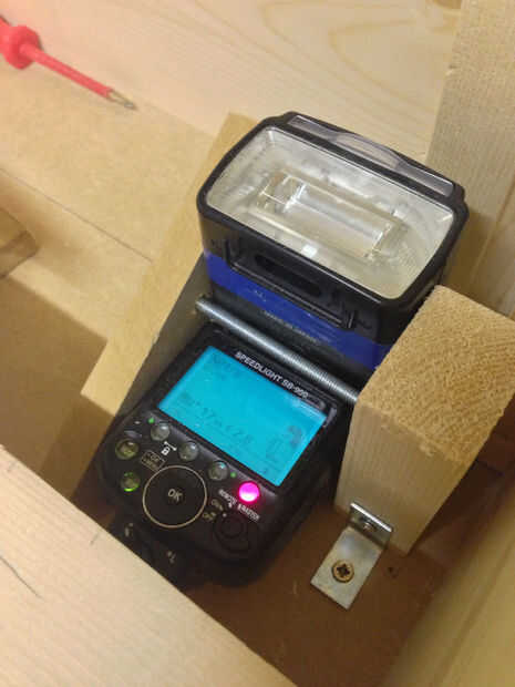 Para montar la cámara y flashes hice un simple soporte de madera, los tornillos y algunos soportes.