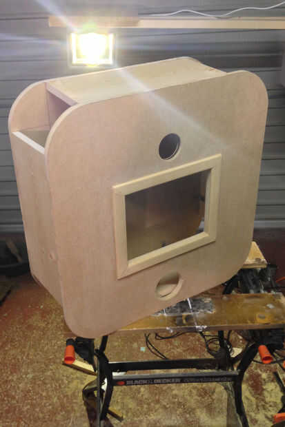 Lados se cortan justo antes donde las esquinas comienzan a doblar. Tornillos y soportes de 90 grados temporalmente unen a la pieza posterior.