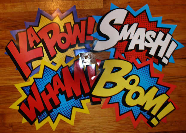 Encontré estos recortes de cartón superhéroe palabra en Amazon aquí. Fácilmente puede pintar encima de las palabras "ver el libro de historietas" así.