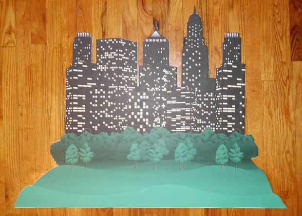 Para nuestra cabina de la foto, empecé con los edificios. Cada Superhéroe necesita una ciudad para proteger! Mi amigo era capaz de encontrar algún papel de tablón de anuncios con un paisaje urbano en él en la escuela donde trabaja y me trajo unos cuantos pies. También puede obtener un rollo aquí. Corte la ciudad y había pegado a un cartón pluma y luego cortar el cartón pluma alrededor de la ciudad. Usted puede también volver a propósito algunas cajas de cartón por la pintura que se vean como los edificios.