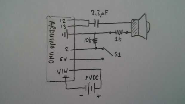 Está bien que los pines 12 y 13 de la desviación en la ONU para la doble salida de sonido al altavoz del mismo. Un potenciómetro se puede poner en lugar del resistor del ohmio de 1 K para control de volumen.