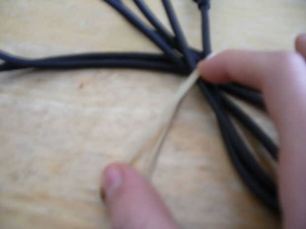 Tome la banda elástica y deslícelo en el cable y luego hacer una figura 8 y envuélvalo alrededor otra vez Cuántas veces necesita hacer esto depende de lo que cable que utilizas (difícil de explicar solo fotos)