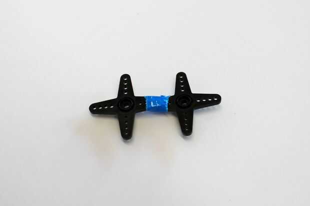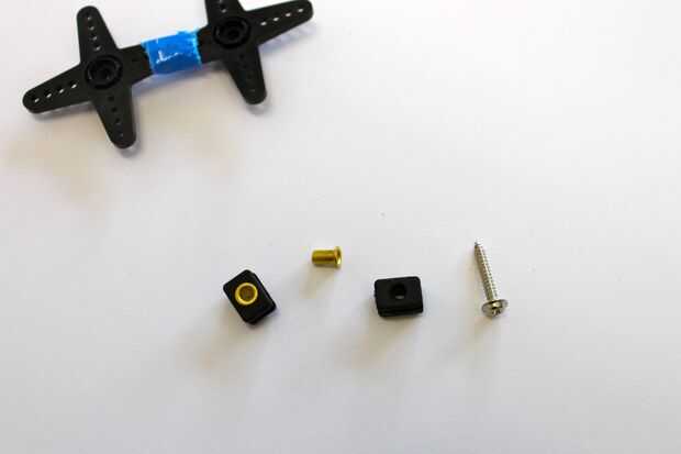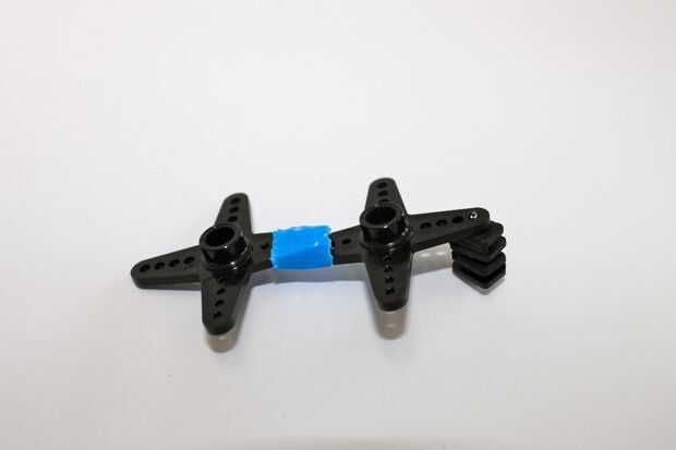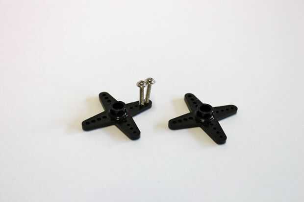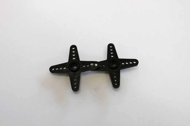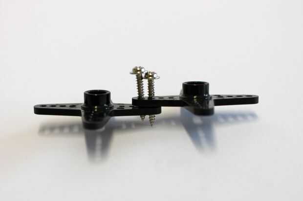 Un cuerno del servo se montará en el servo ya que está previsto originalmente. Pero primero el otro se utiliza para alargar el brazo de palanca. Los tornillos utilizados normalmente para montar el servo en un modelo, puede ser utilizado en los orificios de los cuernos, ser tornillo les en las necesidades de una fuerza. Dos de ellos en los dos orificios exteriores del tornillo hasta que apenas empiezan leerlo hacia fuera en el otro lado. Tenga cuidado al poner la fuerza en ellos. Trabajar sobre una superficie de trabajo sólida.