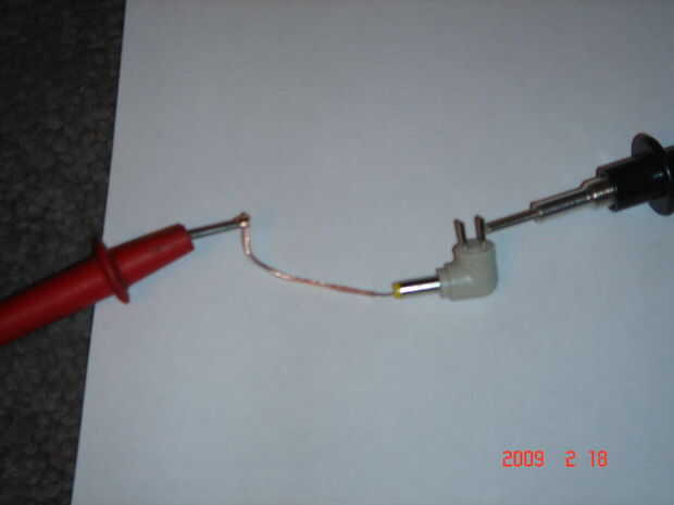Empujar un pequeño alambre en el conector nuevo. Ahora con un multímetro, usted puede encontrar cual de las dos clavijas es el centro de uno o positivo. Puede utilizar una batería y una bombilla para hacer el mismo proceso.