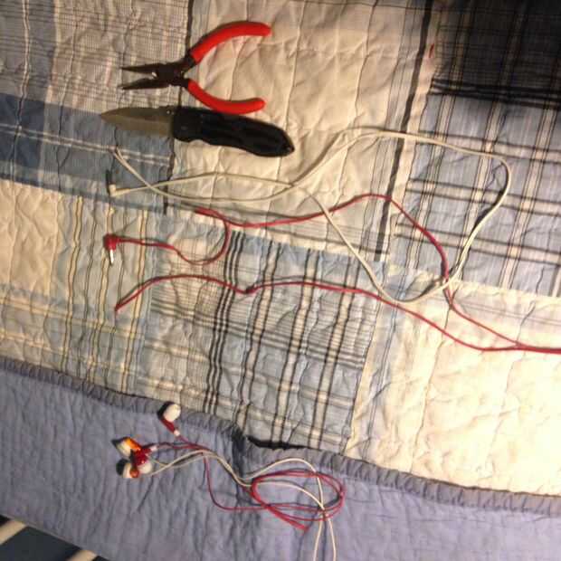 Esto es cuando cortamos nuestros auriculares. Su alicates, corta dos pares de almohadillas de separación el jack de los altavoces, darse como mucho cable que quieras en el lado de la toma.