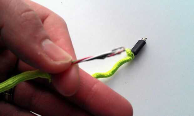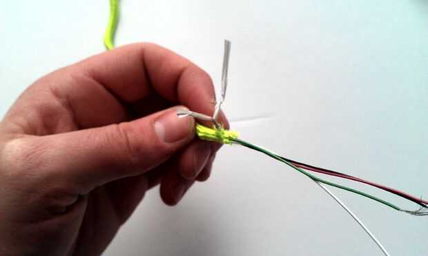 Una vez el cable de cuatro hilos totalmente es probable que tenga unas cuantas pulgadas la izquierda. Tire del cordón hacia atrás para que tengas espacio para trabajar en los cables. El cable se manojo hacia arriba en el extremo. Usted tendrá que seguir allí así que usted puede trabajar en los cables; Encontré un twist tie funciona bien para esto.