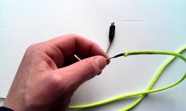 Ahora que el cable es cortado y pelado necesita deslizar el paracord sobre los cables. Para hacer esta curva detrás el metal expuesto hilos para no enganchar el cable. Luego deslice el cable sobre los cables. No debería ser demasiado difícil deslizar el cable en este punto si usted golpea una pega puede necesitar ajuste.