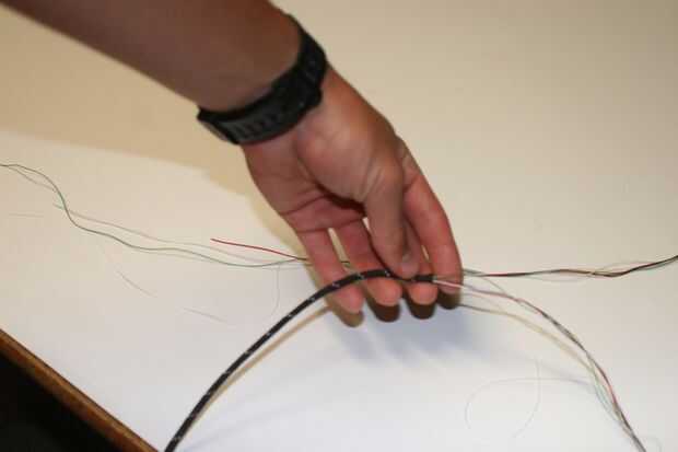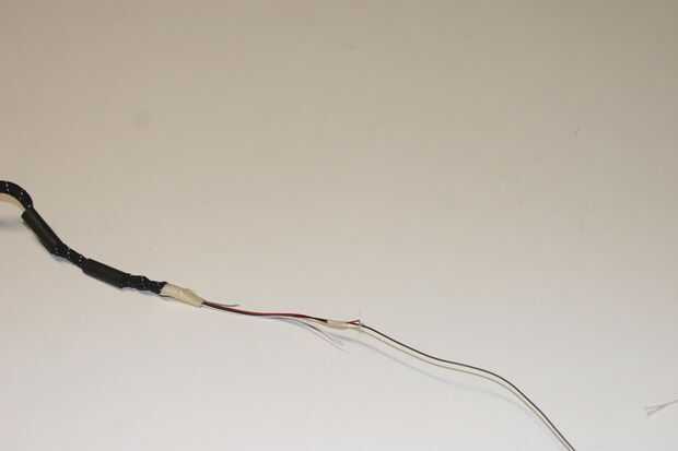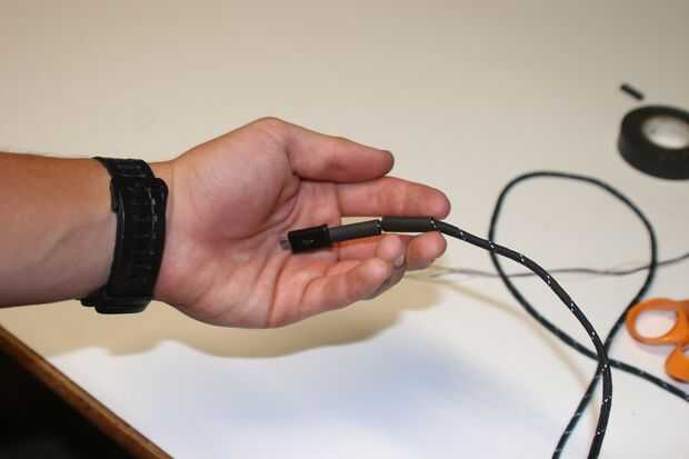 El siguiente es deslizarse sobre el paracord. Tomar la mitad más larga del cable carga y arranque deslizándolo a través del molle. Ayuda a los extremos del alambre, con cinta adhesiva para no quedar atrapado en el paracord como su desplazamiento a través de. Deslice el paracord hasta que sale el otro extremo del hilo. Luego la cinta la paracord (como en la imagen), por lo que no se deslice hacia abajo.