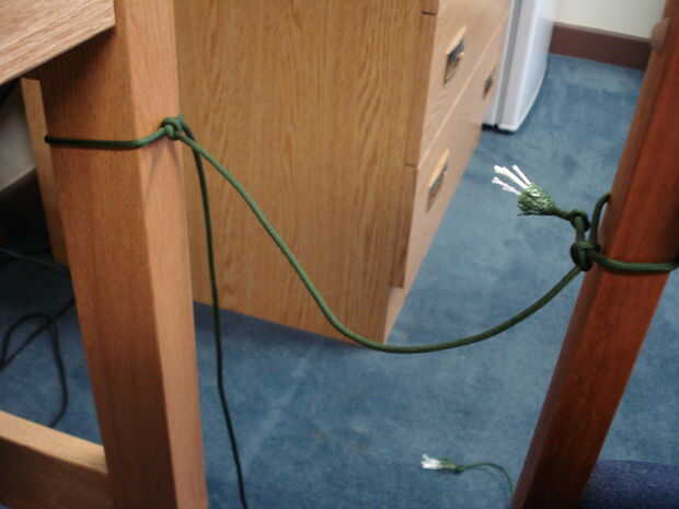2 ejecutar otra longitud de cable (que puede ser parte de las sobras del cable más allá de los puntos si el cable es suficientemente largo) para que pone sobre el cable que cuelga.