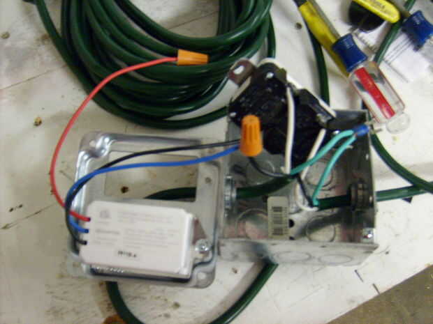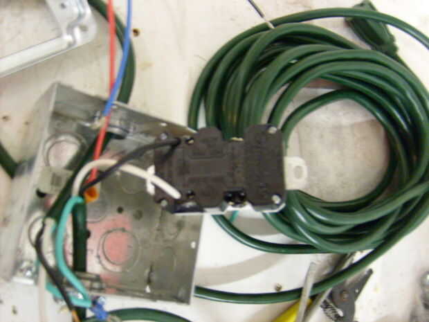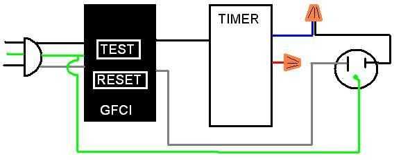 conecté la alimentación entrante directamente al GFCI de esa manera si algo va haywire en el timer se dispara. Desde el GFCI el alambre caliente está conectado al temporizador y el neutro proviene el GFCI y va directamente a la salida. El cable azul desde el programador conecta con la caliente de la salida. Y los motivos son todos atados juntos.