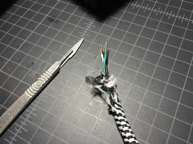 Retire las placas de cubierta de la toma USB. Desde allí tomar el cable de alimentación y averiguar cuánto de la chaqueta debe tira. Utilice cinta eléctrica para envolver donde vas a pelar el cable de alimentación de lo contrario el cable de tela será fray. Luego de la tira de 1-1.5" de los alambres internos.