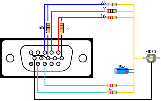 El circuito sí mismo es tan pequeño que puede ser fácilmente construido dentro de una carcasa de conector VGA (que es cómo construí mi prototipo). El circuito es conveniente para los sistemas PAL y NTSC de borh.