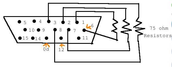 verde (pin 2) -> resistencia de 75 ohm -> vuelta verde (pin 7)