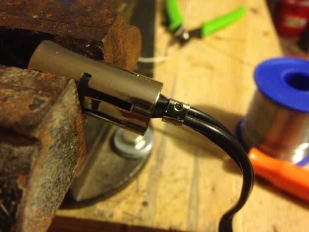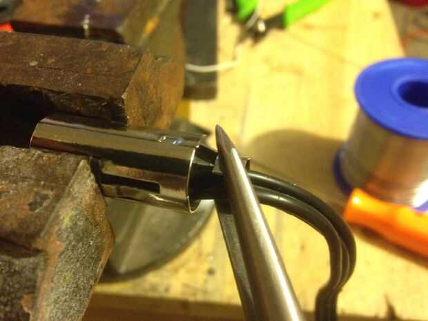 Después de que se seque, te quieren montar la carcasa de metal de dos piezas. Hay agujeros en la caja para las piezas de la base de plástico moldeada para deslizarse en. Una vez en su lugar usted querrá utilizar un par de pinzas para pinzar la abrazadera hacia abajo alrededor de los cables. Esto asegurará que si se tiran los cables no romperá sus empalmes de la soldadura.