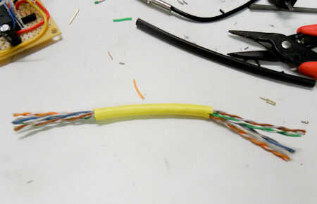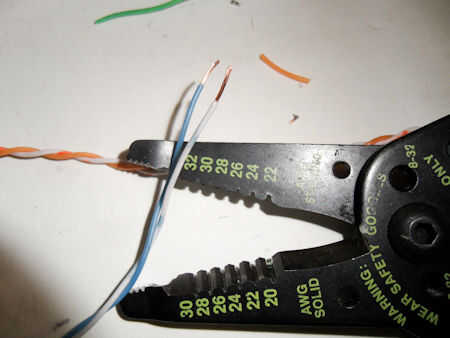 Cortar su cable CAT-5, pantalla exterior de corte con un cuchillo y quitar cables. Hacerlos siempre y cuando sea necesario y utilizar como número de pins que tendrá. Tira los extremos (porción pequeña) con pelacable. Cables de la lata con soldador