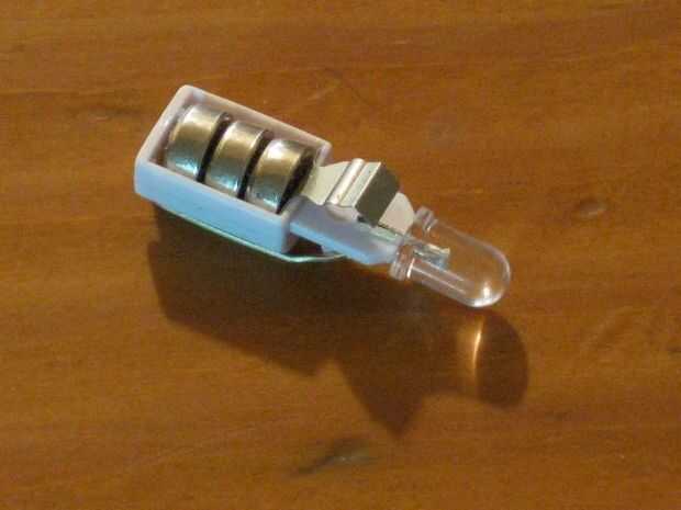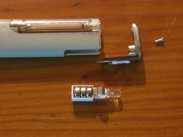 Quitar el tornillo en la parte inferior y... HEY, MIRA! Hay tres pilas en un soporte y un interruptor de botón! Esto es perfecto para el proyecto.