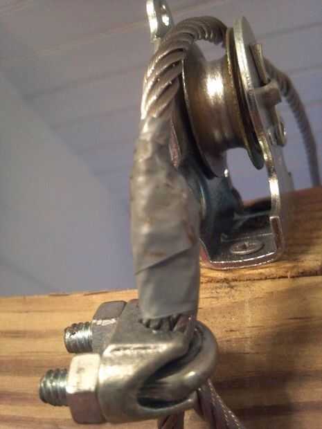 Para el cable que va a la polea inferior, necesita que pase el cable por la polea antes de hacer los bucles en cada extremo, ya que una vez completado los extremos será demasiado grandes para pasar por la polea.