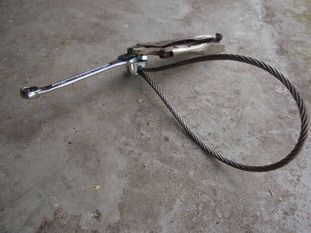 Ahora para la longitud principal del cable. Ya que es casi imposible doblar sobre un pequeño bucle y fijarlo con la abrazadera, me pareció que lo más fácil hacer un lazo grande en el extremo del cable, muy ligeramente la abrazadera y tire un extremo en la abrazadera hasta que se convirtió en un pequeño bucle. Una vez hecho esto en un extremo del cable 7.5", pase el otro extremo los dos lazos creados por encima de la barra antes de repetir el proceso en el otro extremo.