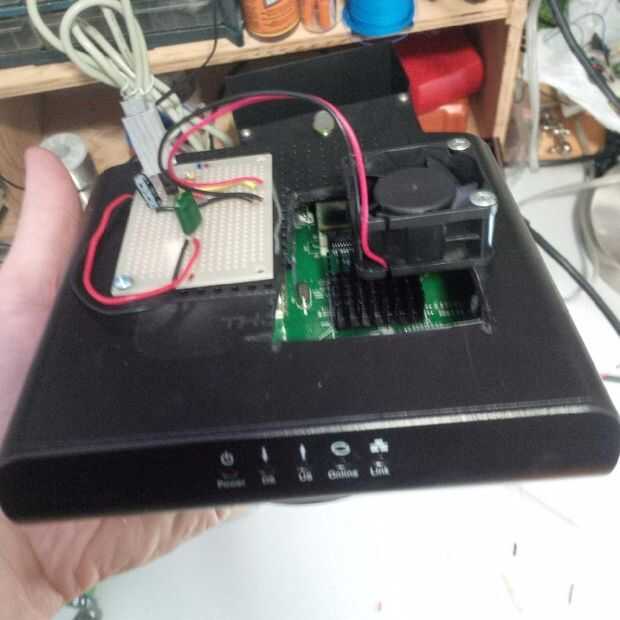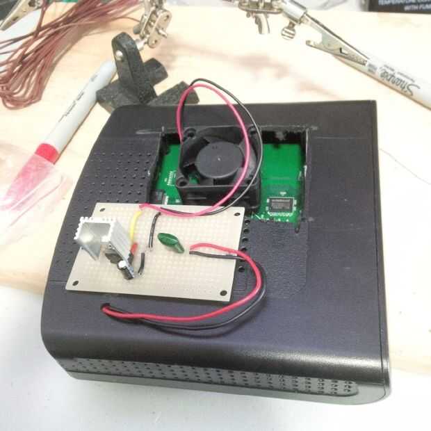 Una vez que esté listo para fijar el tablero al módem, soldar los cables que une antes a la protoboard para la tierra y Vin. Ahora utilizar un conductor tornillo (o taladro) para poner los tornillos a través del Junta ventilador prototipo y en el módem de cable. Como se muestra en la imagen. Como se puede ver, recortado un poco demasiado de la tapa de mi módem, por lo que el ventilador no sentarse muy encima del disipador de calor, pero funciona bien.