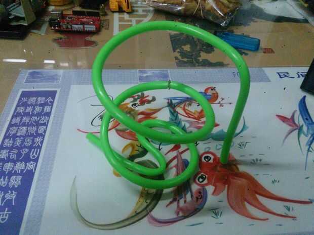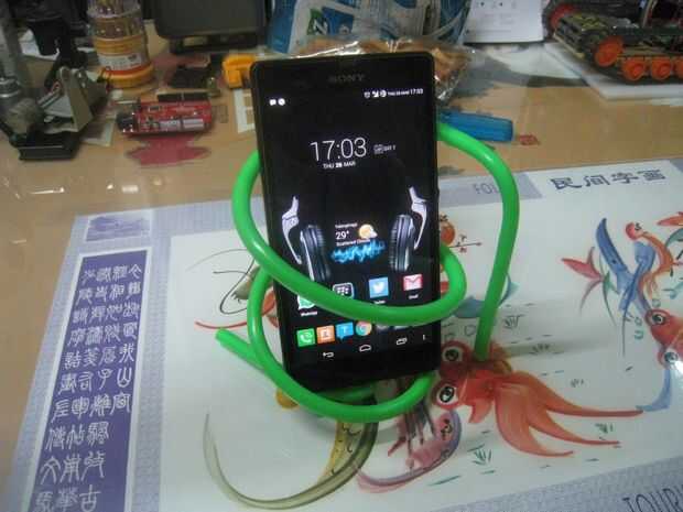 Con un cable más largo, aquí uso dos pedazos de manguera de combustible (alrededor de 32 pulgadas), forma como una taza. El extremo inferior forma de "S" para el teléfono para sentarse, así que eso él no toca la mesa. El otro extremo es curva hacia abajo como un bastón para ayudar a distribuir la masa del teléfono.