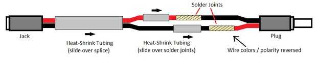 - Tira y estañar los cables, lo suficientemente largos como para que se les puede envolver juntos en línea. (También te recomiendo cortar y desforrar los cables para que los dos la soldadura juntas terminan escalonada / no adyacentes, como se muestra. Reduce la probabilidad que puede corto. Por supuesto, asegúrese de hacer este ajuste para que los cables correctos se sueldan juntos para invertir polaridad.)