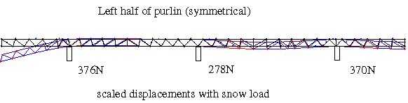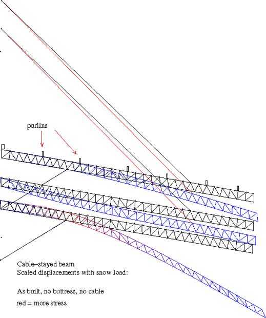 El primer panel muestra un análisis de las correas spruce, cargada uniformemente por la nieve en el techo. Las vigas están espaciadas cada cuatro pies. Medio de una correa se muestra; la correa completa incluye una imagen de espejo de la derecha. El análisis sugiere que la viga de la izquierda debe trasladarse unas 6 pulgadas a la izquierda para que haya menos saliente. Sin embargo, las vigas están limitadas a la echada de 2 pies de los postes apoyo para estar bien asegurada, y el estrés no es irrazonable.
