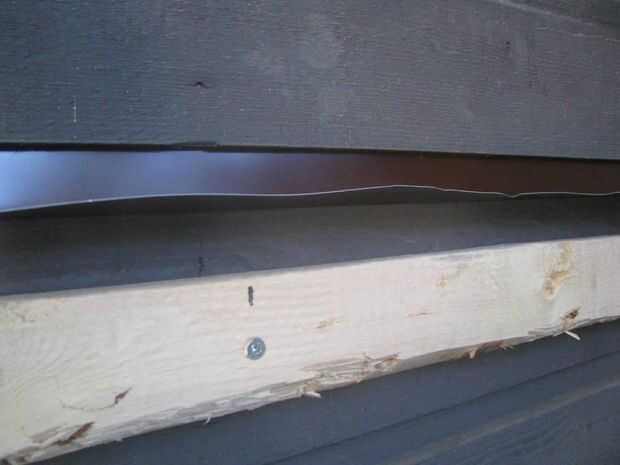 La pared de la casa está hecha de madera contrachapada sobre 2 x 6 clavos en los centros de 2 pies, cubiertos con revestimiento de cedro. A pesar de que la pared está protegida por un amplio Plafón, adición intermitente parecía una buenas ideas ya que no es muy caro y bastante fácil de montar. Se trata de aluminio L-sección intermitente, inserta en el borde de un tablero de apartadero del cedro, que dicta la posición vertical del soporte. El soporte horizontal es abeto de 2 x 3, atornillada a través a los montantes de la pared. Los soportes verticales para tomar los rayos son también abeto de 2 x 3, centrado en los postes de madera.