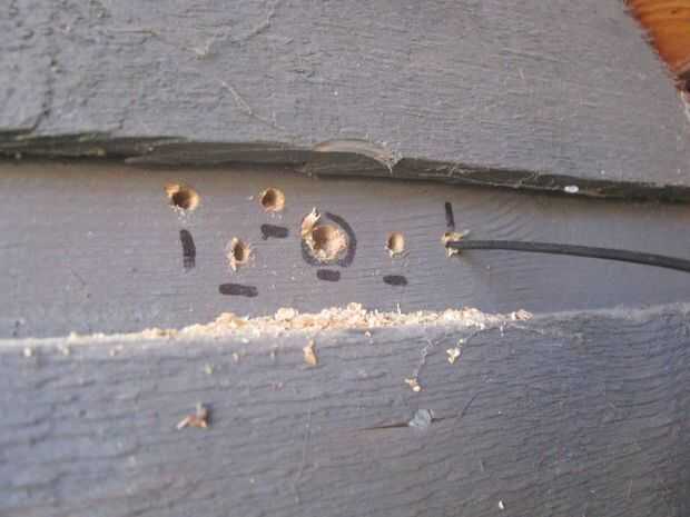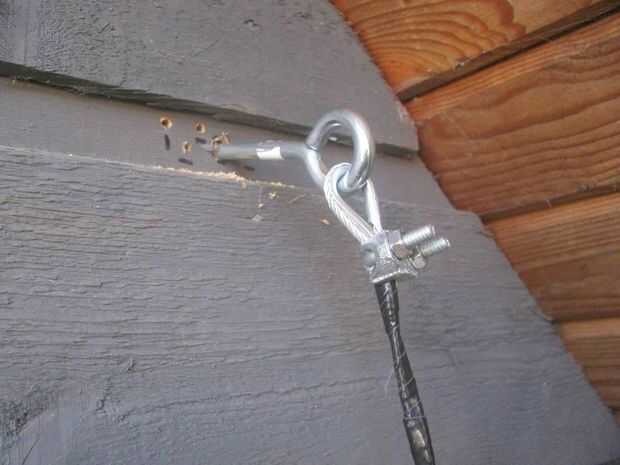 Es importante comprobar que los pernos de anilla para apoyar los cables estén centradas en los montantes de la pared oculta para la fuerza máxima. Aunque el revestimiento se clava a través a los postes, no hay ninguna garantía de que las uñas estén centradas. En consecuencia perforar una serie de agujeros para ubicar los bordes de los montantes utilizando un alambre rígido, luego perforar un agujero para evitar que se resquebraje y atornilla el armella muertos centro. Los cables están provistos de guardacabos y asegurados con dos abrazaderas para cable (se muestra sólo una). Los orificios piloto más tarde se llenaron de sellador.