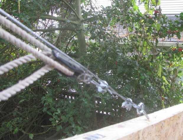 La foto muestra una temprana de la prueba; en la Asamblea real me perforó agujeros en el material Palruf para tomar el cable tensado y ensarta a través de antes de la fijación. Pasé el cable por el techo, a través de ha abrazadera del cable, a través de la armella, nuevamente a través de la mordaza, a través del techo y hace un bucle en el extremo asegurado con otra abrazadera del cable. Este bucle está unido a una polea para todo el cable puede ser tensado tirando de la cuerda, y luego la primera abrazadera apretados antes de que se quita la cuerda y el lazo y la segunda abrazadera quitan junto con la polea. Más tarde, agregué una segunda abrazadera en ambos extremos de los cables para mayor seguridad. En retrospectiva, un tensor podría se han utilizado para el ajuste final, o un tirante (con la mayor ventaja mecánica) utilizado para tensar el cable de forma más eficaz.