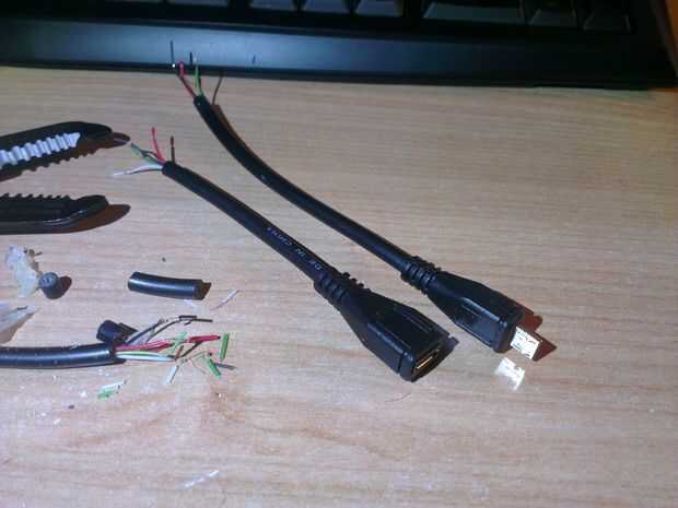 Comienza por cortar el extensor usb micro a la mitad, por lo que el extremo de babor tiene unos 7cm de cable libre. Esto tira hacia abajo de 1,5 a 2cm y tira de aislamiento de cables individuales, por lo debe ser unos 5cm de cable negro izquierda. Hacer lo mismo con la otra mitad de la extensión usb para su uso posterior.