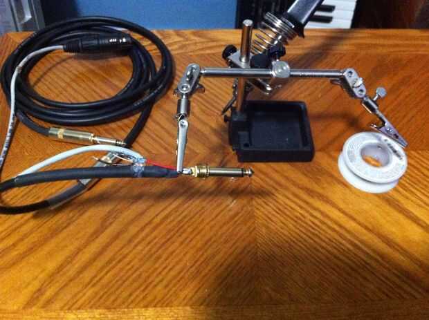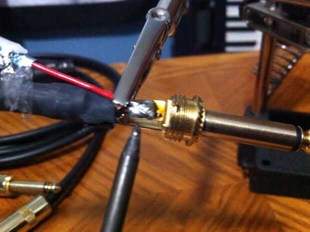 El cable XLR rojo obtiene soldado sobre la lengüeta corta el enchufe mono. Use una atadura o pinzas para sostener el cable donde usted lo necesita para ser. Si allí está expuesta de la soldadura del conector mono y son capaces de derretir solo el cable rojo en la soldadura expuesto, que es probablemente la mejor manera de ir, entonces no necesita añadir nueva soldadura o molestar con flujo.