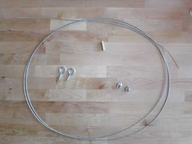 1. acero cable - recogí cerca de 8 pies de 1/8" de acero de cable de la ferretería en aproximadamente 18 centavos por pie. Puede utilizar cable de acero más grueso -, pero a menos que tu va a ser suspender un montón de papel (más de unos cientos de libras vale la pena) el cable trenzado de 1/8" está muy bien.