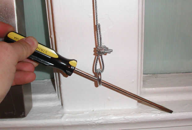 Su más fácil de conectar el cable una vez que uno de los anclajes ya está en la pared. Perfore un orificio piloto para el ojo de tornillo y gire en la pared. Usar un destornillador pegado por la parte redonda del ojo como una manija de palanca tornillo a veces cuando es difícil girar con la mano.